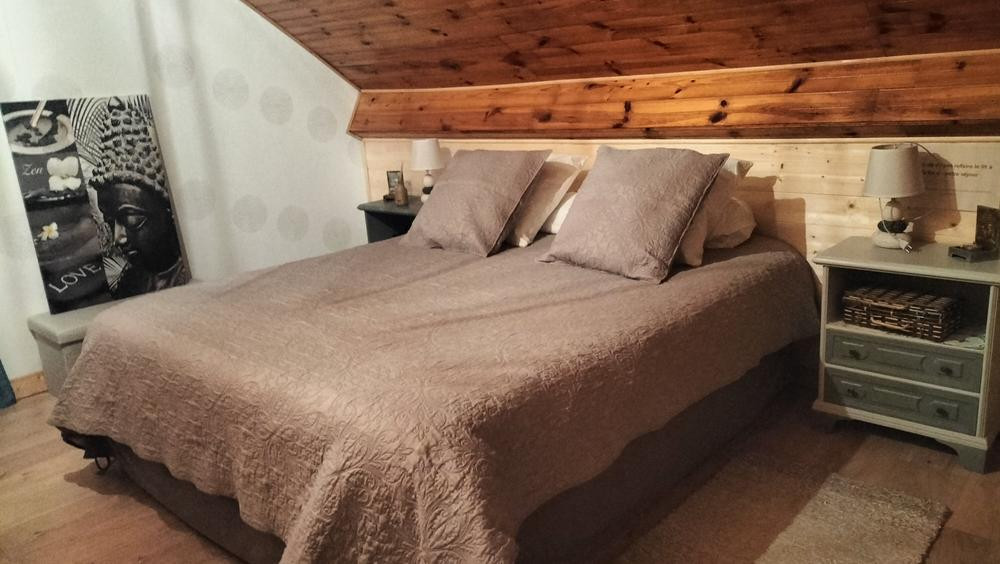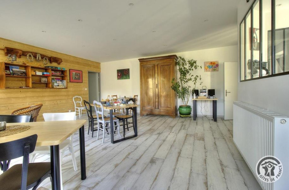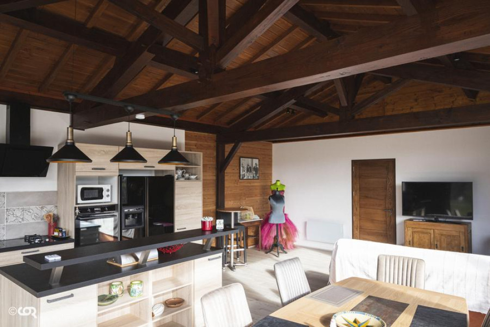 For your next holidays, come and discover "La maison d'à côté" in a quiet hamlet near Lac des Sapins in the Haut Beaujolais region, just 1 hour from Lyon. With its 4 bedrooms and 3 bathrooms, the gîte is ideal for getting together with family or friends. The owners will be delighted to welcome you to their house, which has been lovingly restored using local materials. You'll be seduced by the wooden furniture, meticulous decoration, spaciousness and comfort. Overlooking the village, the gîte offers an unobstructed view, ideal for contemplating magnificent sunsets. First floor: spacious living room with wood-burning stove opening onto a fully-equipped kitchen, 1 large family bedroom (1 double bed, 1 single bed) with en-suite shower room and WC, 1 further separate WC and a laundry room. Upstairs: 3 bedrooms, 1 bathroom with bath, shower and WC and another separate WC. The 3 bedrooms are: 1 large bedroom with 1 double bed and en-suite shower room; 1 bedroom with 1 double bed that can be converted into 2 single beds; 1 bedroom with 2 single beds. You'll enjoy an enclosed garden with its own terrace, complete with furniture, deckchairs and charcoal barbecue. A ping pong table and a molkky game are also available. Private parking in front of the gîte entrance.