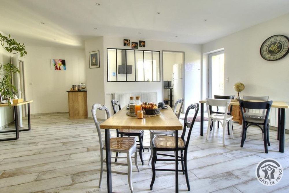 Come and stay with your family or friends at the villa ‘l'Ambremy', ideally located less than 500 m from the Lac des Sapins. On site, you can enjoy a wide range of sports and leisure activities: lounging, swimming, picnics, water sports, tree climbing, fishing, walking, cycling or horse-drawn carriage rides, mini golf... Modern in design, with underfloor heating (heat pump), this single-storey gîte offers all the comforts needed for a group. The living room is very bright and opens directly onto the terrace with its lovely views. The accommodation is arranged around a large living room with a sitting area, a dining area and a fully equipped kitchen area. On either side of the living room are two sleeping areas, each with 2 bedrooms (three with large built-in wardrobes) and a shower room: