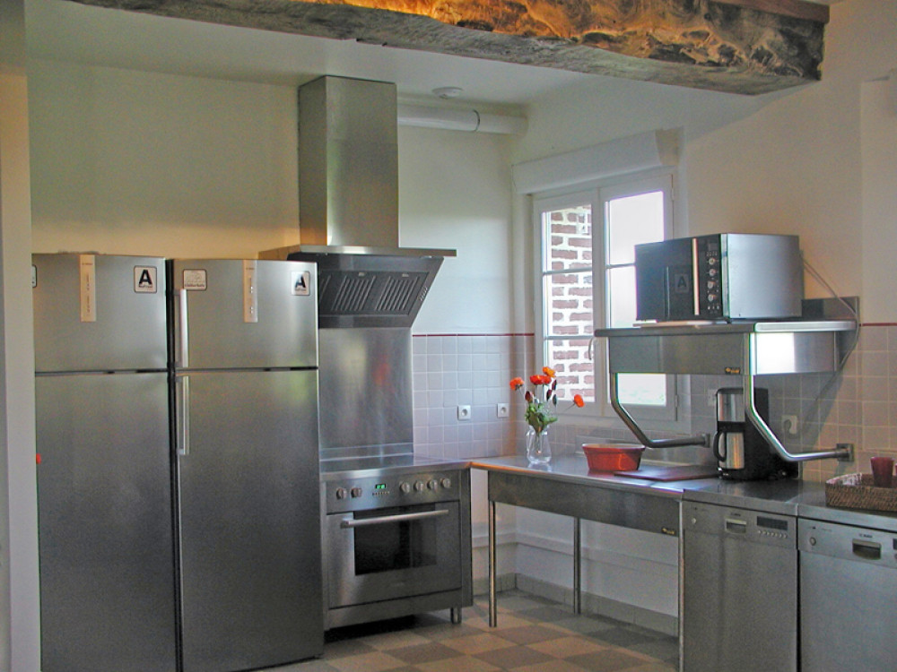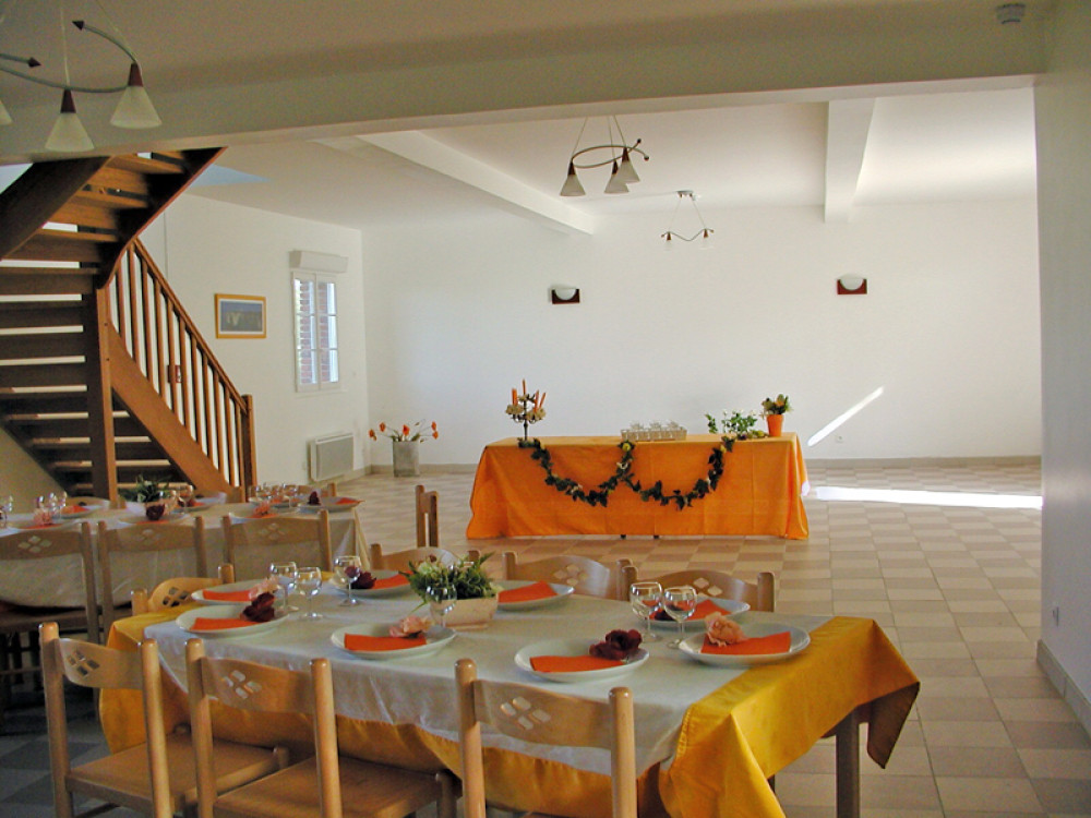 Au rez de chaussée : - salle de réception de 170 m² pouvant accueillir 120 personnes en réception ou séminaire, - cuisine ouverte disposant de 2 lave vaisselle, 2 réfrigérateurs grande capacité, 1 four micro-ondes et une cuisinière professionnelle, - 1 chambre 1 lit 2 personnes avec salle d'eau et wc privatifs et entrée indépendante accessibles aux personnes à mobilité réduite, - 1 chambre de 4 personnes avec lits 1 place dont 2 superposés et lavabo. - 2 wc A l'étage : - 4 chambres comprenant chacune 4 lits de 1 personne et lavabo, - 2 chambres comprenant chacune 2 lits de 1 personne et lavabo, - 1 chambre comprenant 6 lits de 1 personnes et 2 lavabos, - 3 wc, - 3 salles d'eau. Détail couchage : 1 lit double - 28 lits simples - 2 lits superposés Salle de réunion et séminaire : 500 € la journée Extérieur : Devant le gîte : parking 2 voitures pour personnes à mobilité réduite, et à proximité un parking 25 voitures. Agréments : - Jeunesse et Sports - Education Nationale