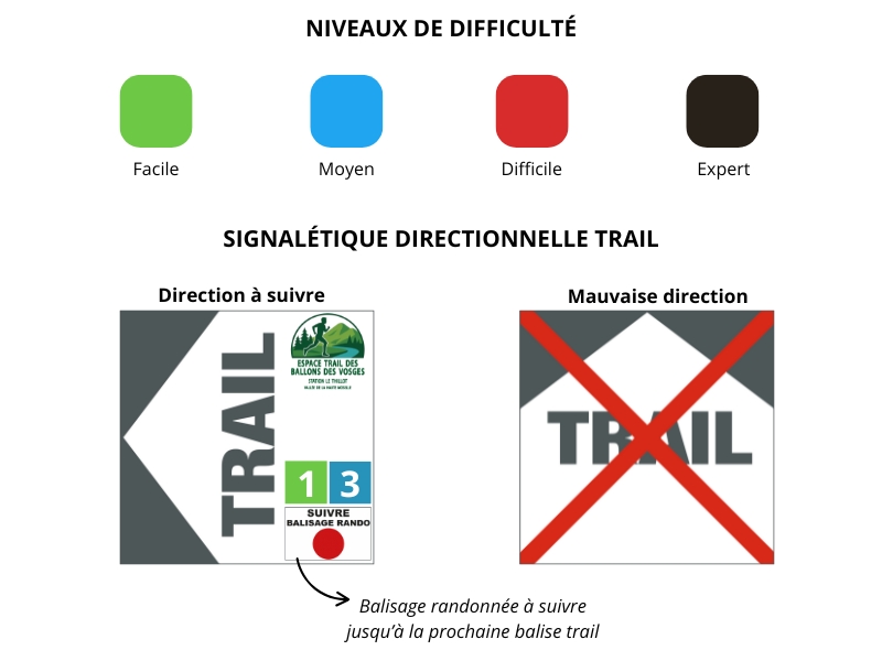 Les parcours sont équipés de balises directionnelles Trail. Sur chaque balise est apposé le(s) numéro(s) du parcours à suivre et leur couleur de difficulté (vert – bleu – rouge – noir).