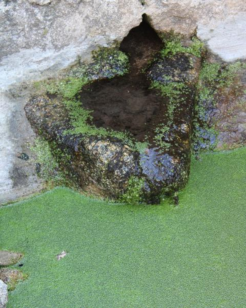 Sans doute construite au XVI? siècle, elle est abritée par une voûte de pierre et alimentée par une source qui coule dans une vasque en granit. Le trop-plein s’écoule ensuite pour irriguer les jardins voisins, autrefois cultivés en potagers et plantés d’agrumes.