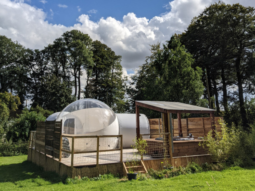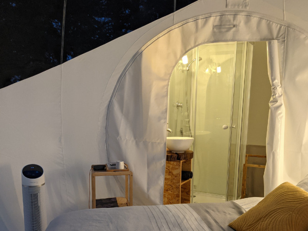 Solidement ancrée sur une terrasse de pin massif, votre bulle est composée de trois parties. Un sas dressing, une sphère salle d'eau avec douche, vasque et toilettes sèches et la sphère principale de 4 mètres de diamètre dont la voûte transparente haute de 3 mètres vous ouvre la vue sur le ciel et les cimes des arbres. Elle est équipée d’un lit 160 x 200. Le prêt du linge de lit, de toilette et des peignoirs sont inclus dans la prestation. Le petit déjeuner inclus dans le prix de la nuitée sera à disposition sur la terrasse et pourra être consommé à l'intérieur ou à l'extérieur de la bulle en fonction du temps.