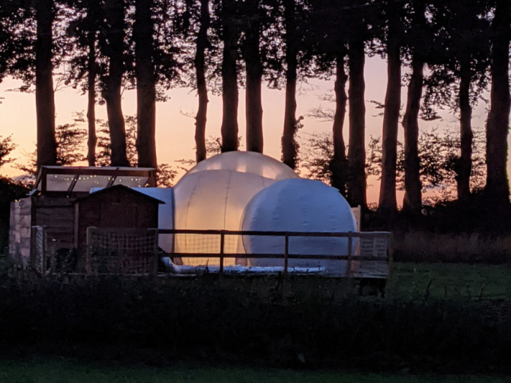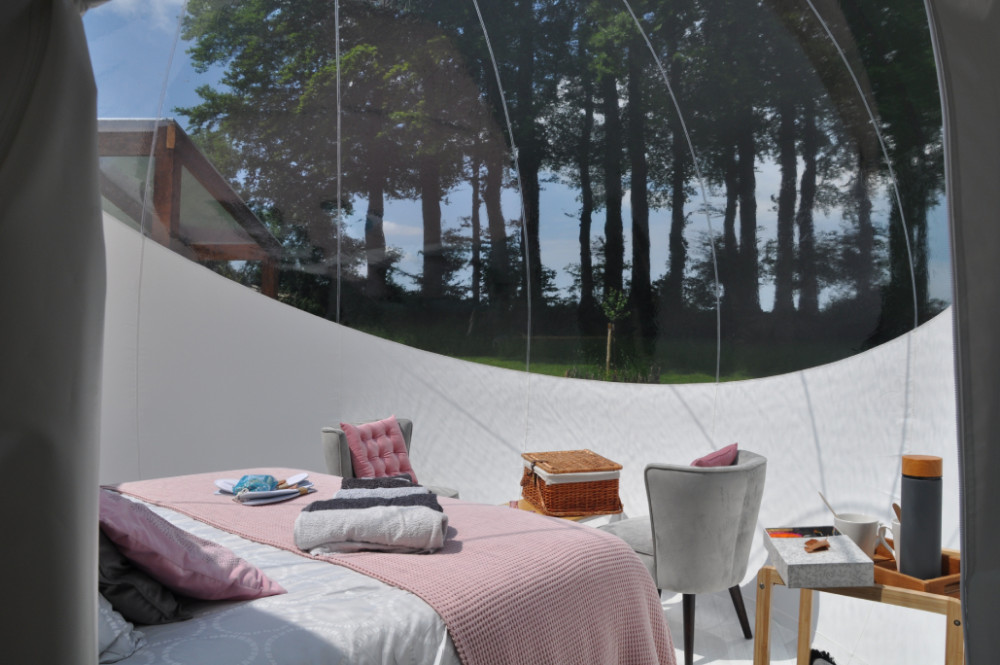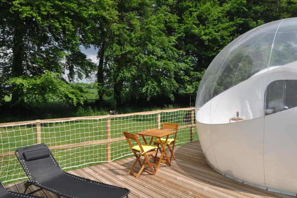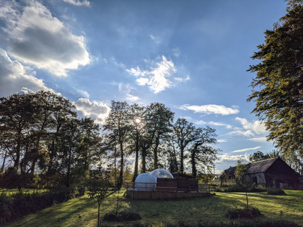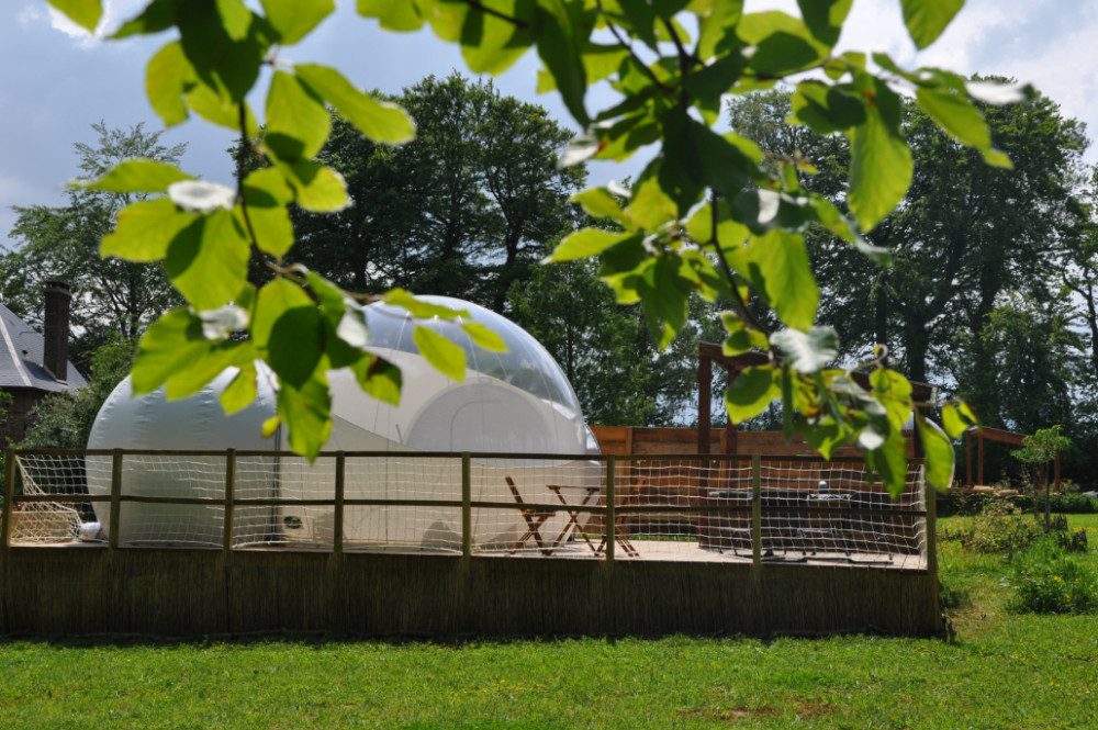 Solidement ancrée sur une terrasse de pin massif, votre bulle est composée de trois parties. Un sas dressing, une sphère salle d'eau avec douche, vasque et toilettes sèches et la sphère principale de 4 mètres de diamètre dont la voûte transparente haute de 3 mètres vous ouvre la vue sur le ciel et les cimes des arbres. Elle est équipée d’un lit 160 x 200. Le prêt du linge de lit, de toilette et des peignoirs sont inclus dans la prestation. Le petit déjeuner inclus dans le prix de la nuitée sera à disposition sur la terrasse et pourra être consommé à l'intérieur ou à l'extérieur de la bulle en fonction du temps.