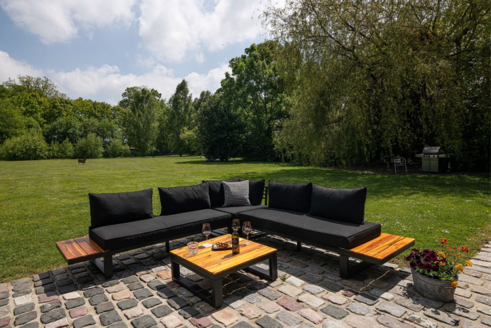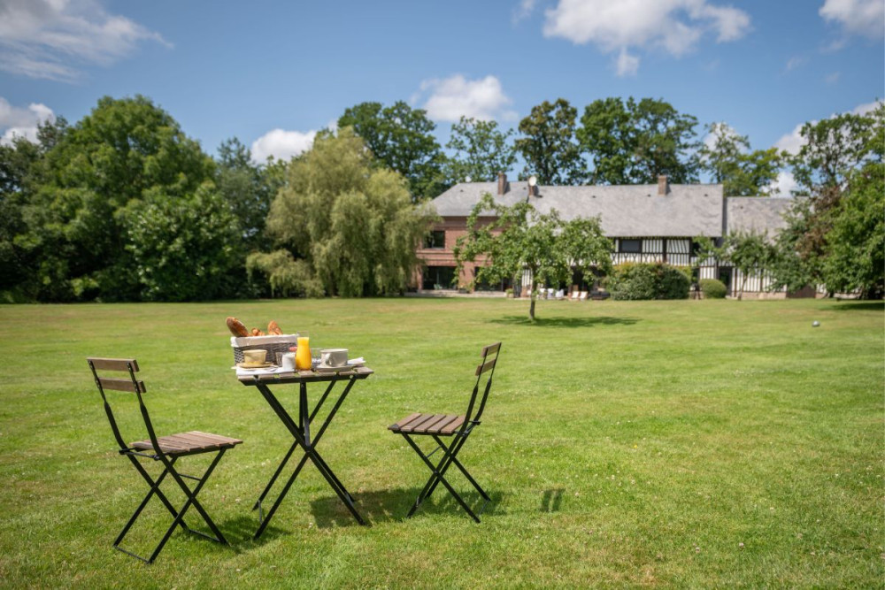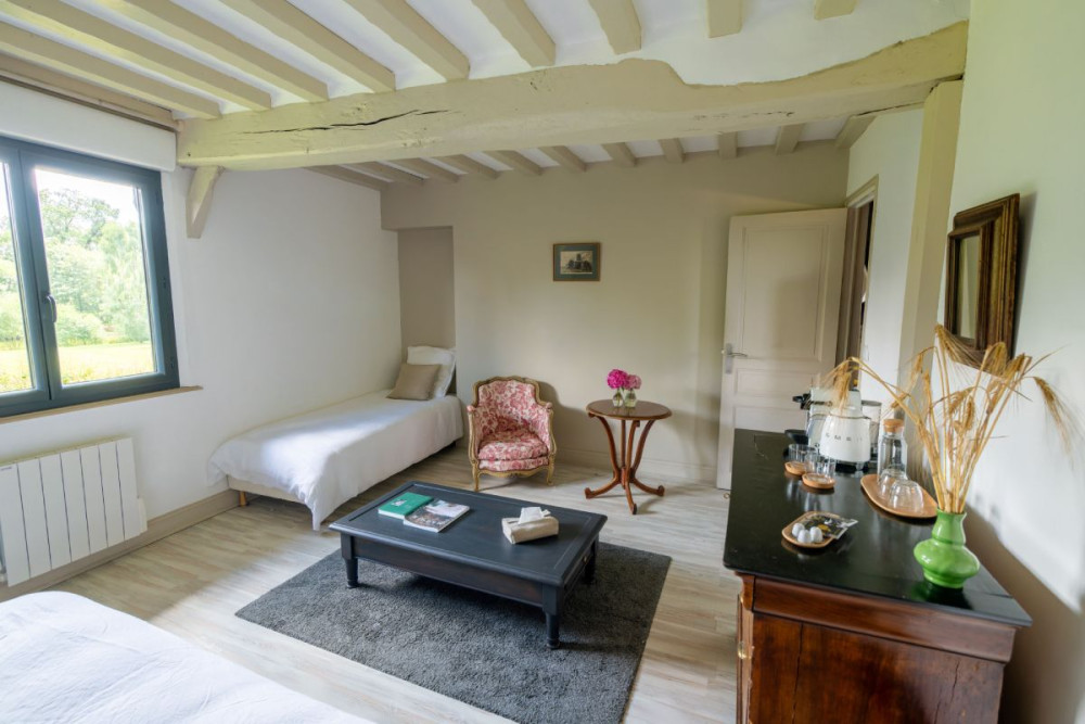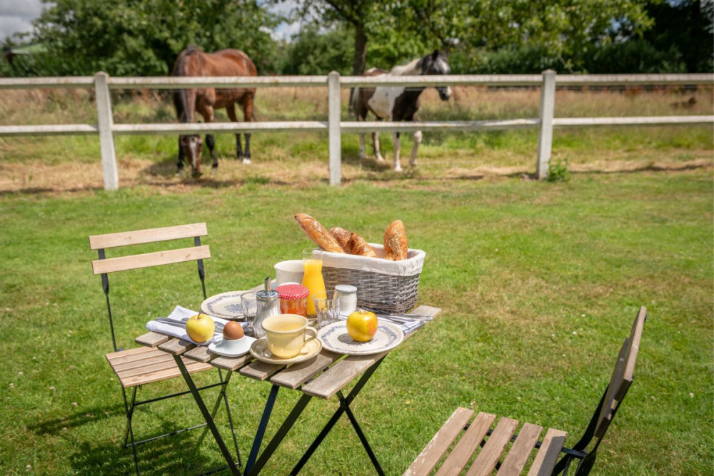 De larges baies vitrées dominent le jardin et l'étang et les chevaux en fond. Le petit déjeuner local est inclus.